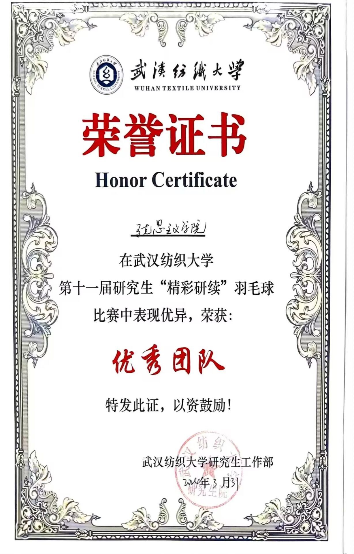 3月30-31日,武汉纺织大学第十一届“精彩研续”研究生羽毛球比赛在阳光校区大学生活动中心如期举行,博彩网站排行 6名研究生选手(谢姚君楠、李满、胡姗、范美志、陈文鑫、贾卫振)参加比赛。博彩网站排行 获得了优秀团队奖,其中谢姚君楠获得了优秀个人奖。