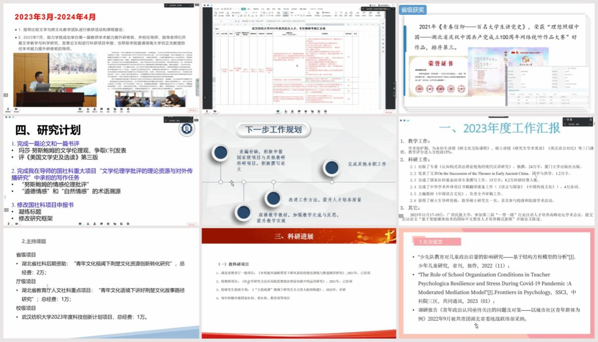 博彩网站排行 阳光讲席教授项久雨和外国语博彩网站排行 阳光讲席教授季水河分别委托团队成员常沛和刘方荣做报告发言,介绍了近3年指导学校马克思主义理论学科、外语学科在人才培养、学科建设方面所做的工作和取得的成果。博彩网站排行 阳光特聘教授金艳、王海燕展示了在教学质量提升、科研成果产出和社会服务等方面的突出成绩。张守慧、李少多、陈春兰等12名参加2023年度考核的博士专任教师对照合同任务,逐一报告了任务完成情况。