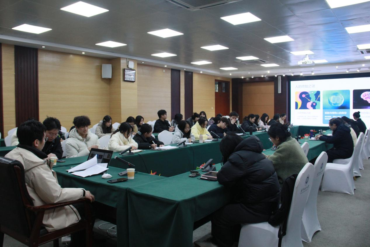 报告中,王世鹏首先以古希腊神话“忒修斯之舟”为切入点,引出了同一关系判定的矛盾、同一关系的判定原则以及人格同一性问题的特殊性。随后从胚胎、植物人与人的终始之谜、人格性与心理学路径、生物学路径与人类动物、人格性的动物主义阐释等方面对人格性问题进行了详细讲解。王世鹏表示,我们对自身的认识是一个永恒的话题,并且总是在一定的参照下进行的。基于动物主义的立场说明人格性,就意味着将人格性作为一种关系属性来理解,在此意义上,人格性是一个相对概念,不同阶段的人类动物所拥有的人格性的强弱可以通过其所涉及的利益关系的多寡体现出来。在交流互动环节,现场师生围绕报告内容发表自己的观点并就相关问题提问,王世鹏逐一细致回应,现场学术氛围浓厚。