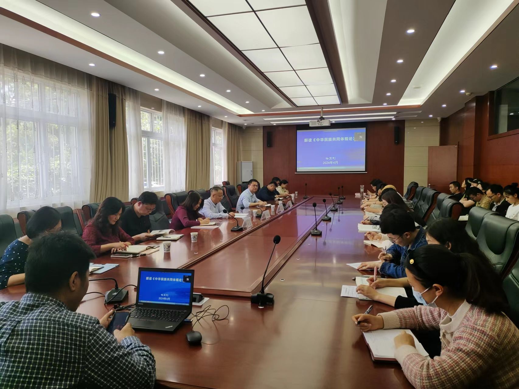 哈正利从“一部中国史,就是一部各民族交融汇聚成多元一体中华民族的历史”观点引入集体备课会主题,深入阐释习近平总书记关于加强和改进民族工作的重要思想,系统讲述中华民族共同体的历史脉络和丰富内涵。他与大家分享了参编《中华民族共同体概论》教材的艰辛过程,详细解读教材体系,澄清了五种错误的史观,阐释了正确的中华民族历史观,就如何引导学生牢固树立正确的中华民族历史观,牢固树立休戚与共、荣辱与共、生死与共、命运与共的共同体理念上了一堂既有理论深度,更有历史厚度的示范课。