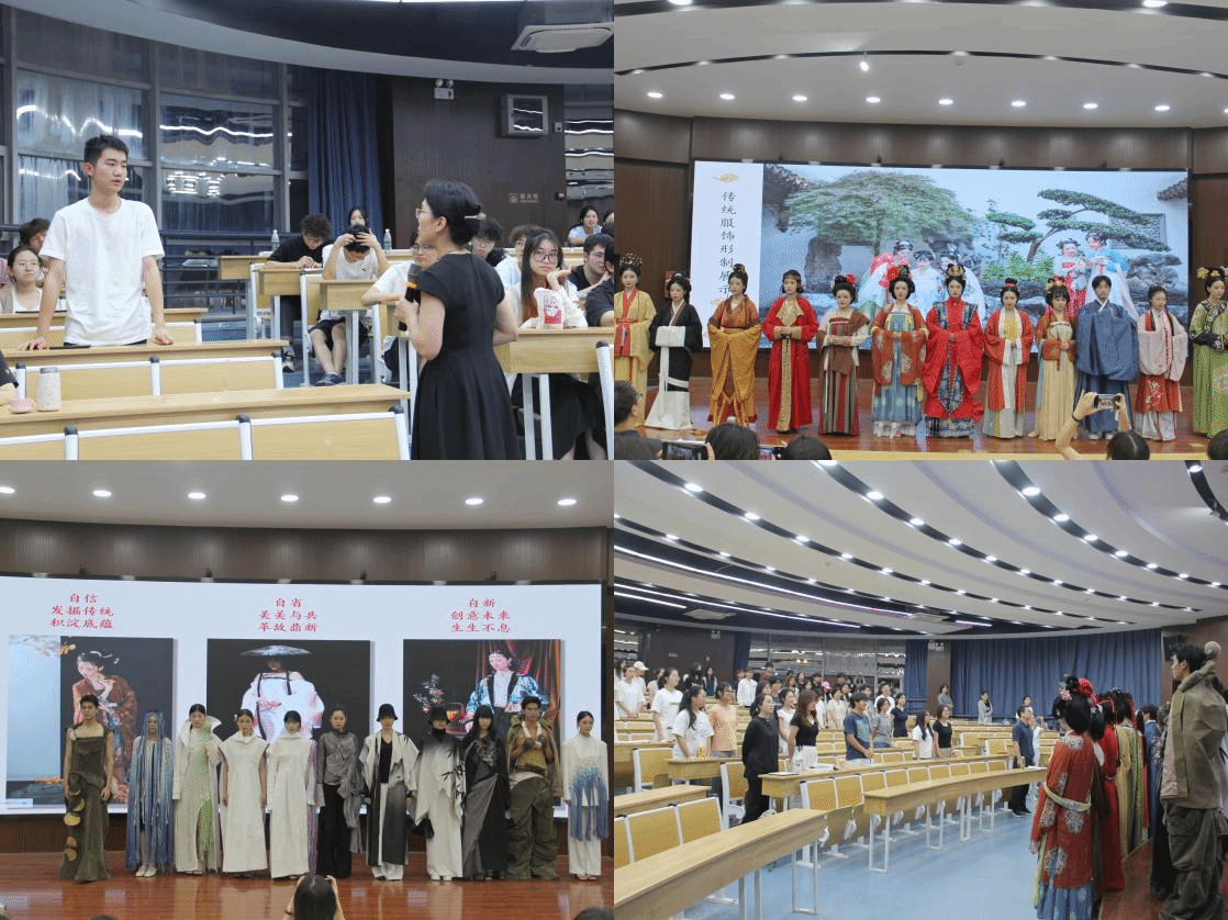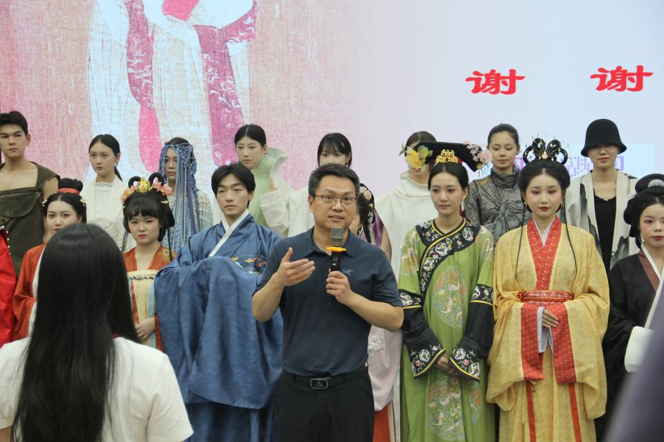 为增强现场体验感,服装博彩网站排行 研究生身着按史料复原的周制深衣、唐制齐胸襦裙、明制马面裙等经典形制服饰,进行立体动态展示。随后,服装表演专业的学生带来一场“传统与现代的对话”主题走秀,借由面料混搭、结构重构,直观演绎传统服饰文化与现代设计理念的碰撞交融。陶辉结合每件服饰的纹样寓意、剪裁工艺,深入阐释了“自信—自省—自新”的文化逻辑:挖掘传统服饰底蕴筑牢自信根基,以开放视野推动多元融合与变革作为自省方向,借创意设计让传统服饰文化在当代焕发生机,实现文化自信。