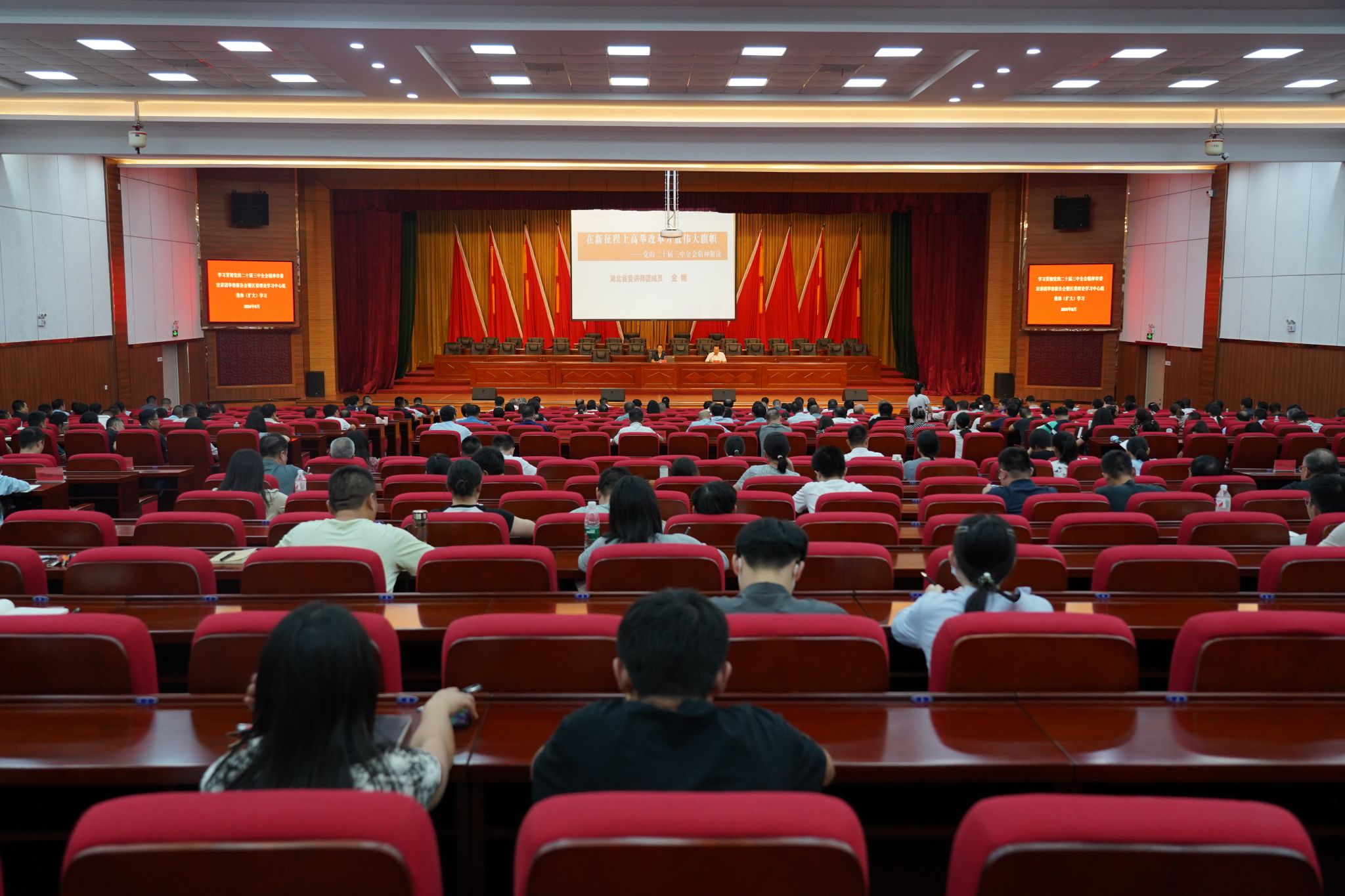 8月23日,学习贯彻党的二十届三中全会精神市委宣讲团华容报告会暨区委理论学习中心组集体(扩大)学习会议举行,省委宣讲团成员、武汉纺织大学党委常委、组织部长金艳作示范宣讲报告。市委宣传部常务副部长刘荣出席,区委副书记、区长龚骏主持报告会。