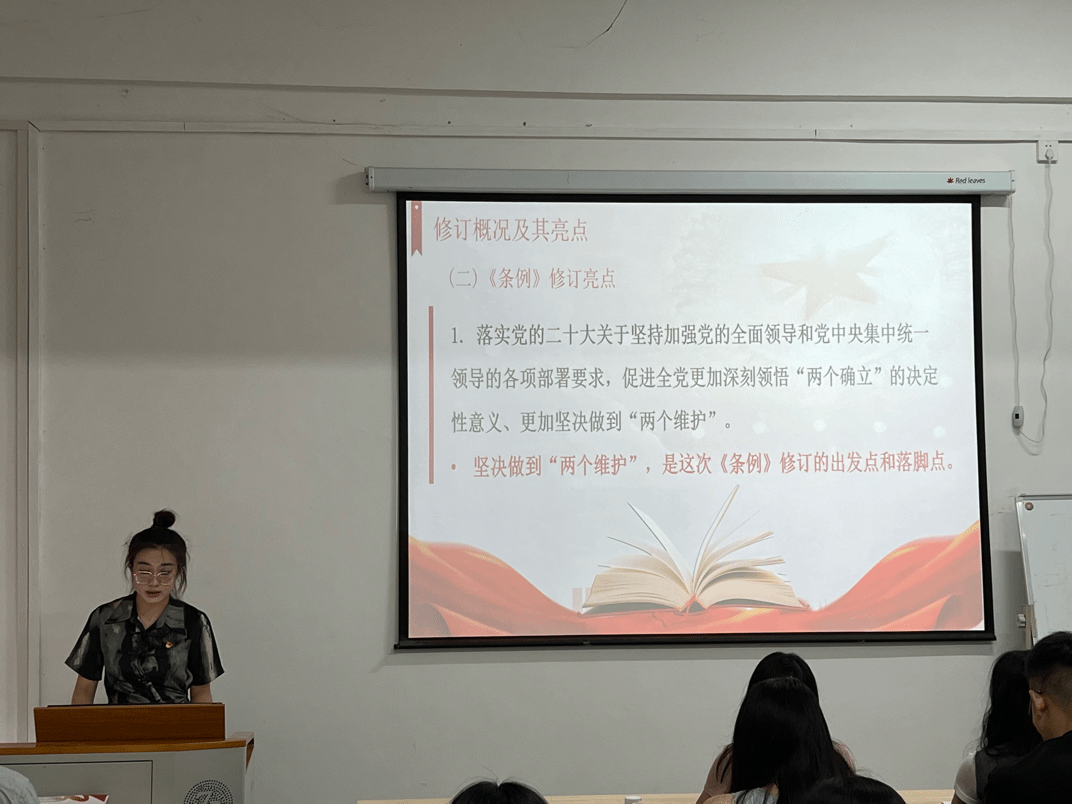 蒋彭阳从《中国共产党纪律处分条例》(以下简称《条例》)修订概况一一讲解。她指出新修订的《条例》始终贯穿“坚决维护习近平总书记党中央的核心、全党的核心地位,坚决维护以习近平同志为核心的党中央权威和集中统一领导”的要求,是总结从严管党治党经验、实现制度与时俱进的实践创新。随后,蒋彭阳以翔实的案例对《条例》修订的九大亮点进行解读。她强调纪律是管党治党的“戒尺”,也是党员约束自身行为的标准和遵循,广大学生党员要结合自身情况不断增强纪律意识,把严守纪律规矩落到实处,使铁的纪律真正转化为日常习惯和自觉遵循。