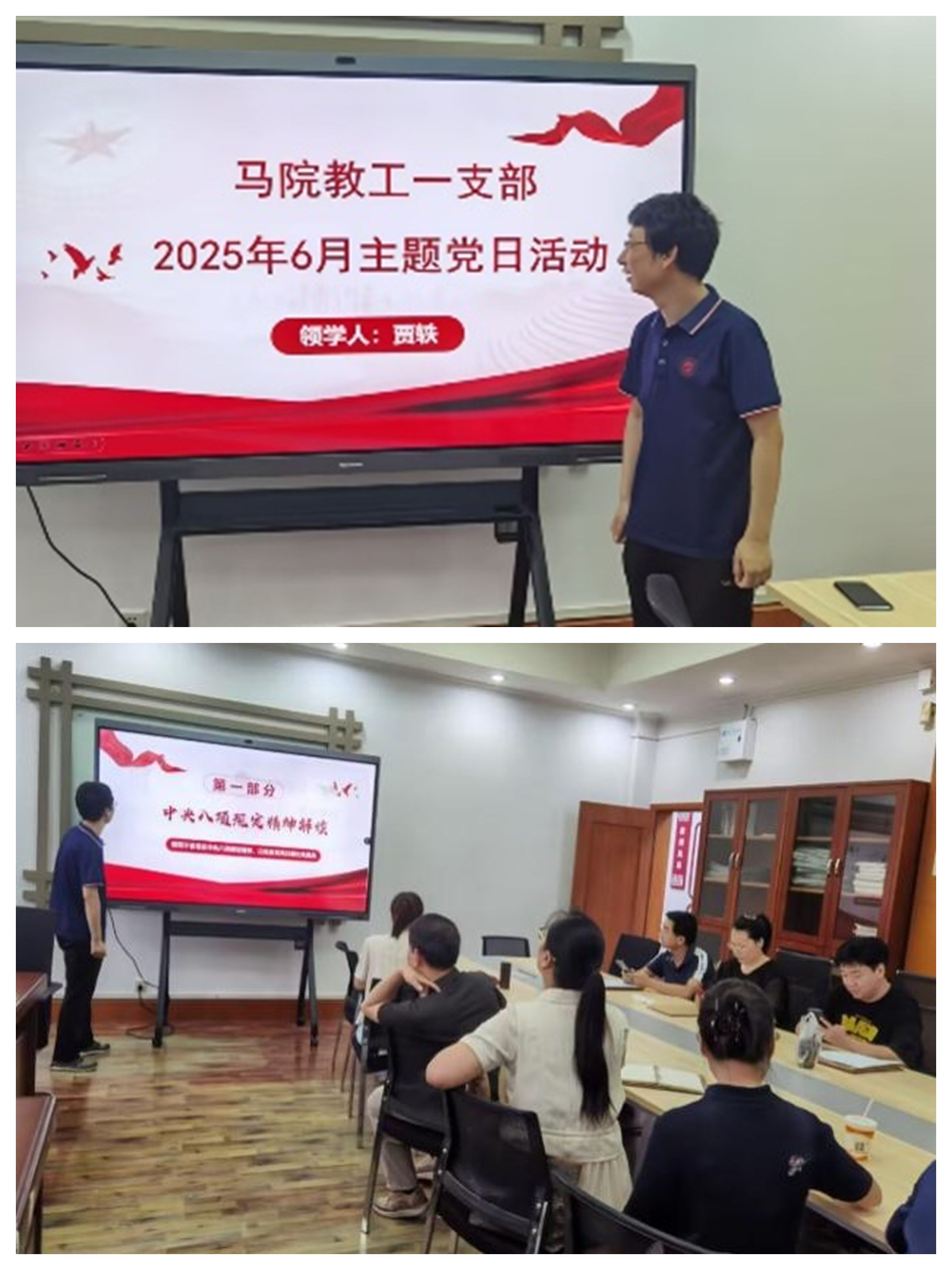 支部党员贾轶对6月主题党日学习内容进行领学,领学内容分为两个专题:一、习近平总书记重要文章、贺信,包括两个部分:1、《锲而不舍落实中央八项规定精神,以优良党风引领社风民风》(习近平《求是》2025年第10期)《加快建设教育强国》(习近平《求是》2025年第11期);2、习近平致复旦大学建校120周年的贺信;二、深入贯彻中央八项规定精神学习教育,包括两个部分:1、《党政机关厉行节约反对浪费条例》;2、中央层面深入贯彻中央八项规定精神学习教育工作专班、中央纪委办公厅关于湖北黄梅、安徽宿松党员干部违规吃喝严重违反中央八项规定精神典型问题的通报。
