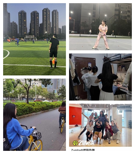 无论是晨光曦微,还是华灯初上,无论是河边的绿道,还是学校田径场跑道,到处都有同学们奔跑的身影。如遇上雨天同学们也能想方设法充分创造各种运动环境:宿舍、健身房都曾留下他们坚持的足迹。在运动中,大家的激情和速度也充分得到释放和燃烧。散步是同学们喜闻乐见的锻炼方式,每逢傍晚,同学们迈着矫健的步伐纷纷投入到走路的行列当中,沐浴在夕阳余晖中,让心灵与大自然轻轻对话,如同品味生活的甘甜,令人陶醉,在心灵得到片刻休憩后,又重新投入到学习工作当中。伴随着动感十足的节奏,同学们舒展四肢,拉伸筋骨,做着帅气有力的舞蹈动作。他们饱满的热情、变化新颖的舞姿、挥洒汗水的身影成为了一道亮丽的风景线,大家热情高涨,脸上洋溢着欢快的笑容。