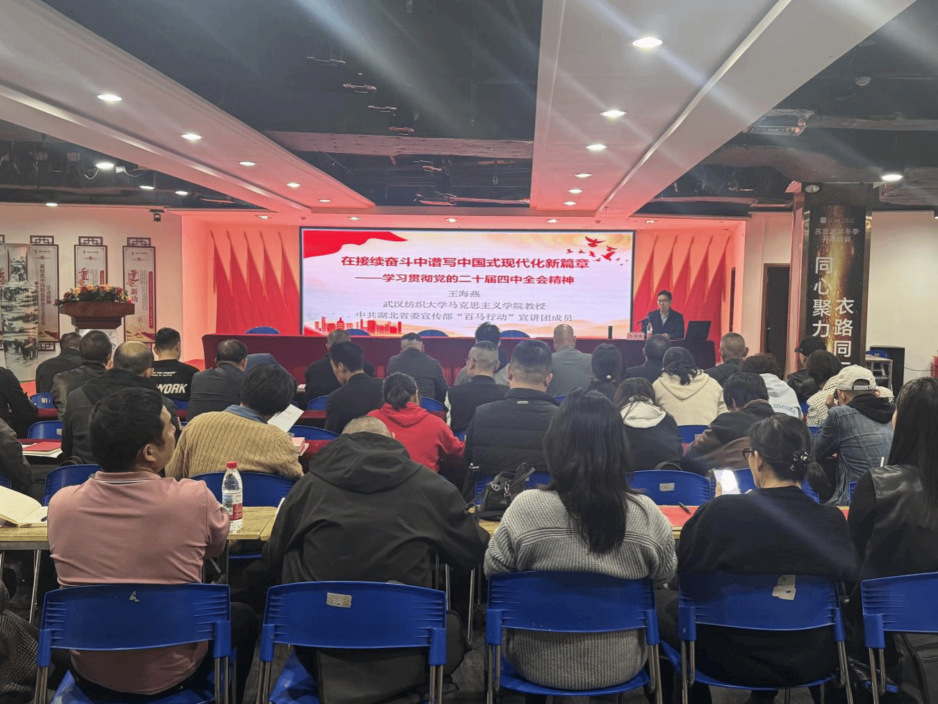 为深入学习贯彻党的二十届四中全会精神,推动党的创新理论在基层落地见效,10月29日下午,博彩网站排行 教授、中共湖北省委宣传部“百马行动”宣讲团成员王海燕教授赴学校“理论热点面对面”实践基地-汉正街道流动党员专题培训班开展“在接续奋斗中谱写中国式现代化新篇章”学习贯彻党的二十届四中全会精神主题宣讲。汉正街道40余名流动党员参加。